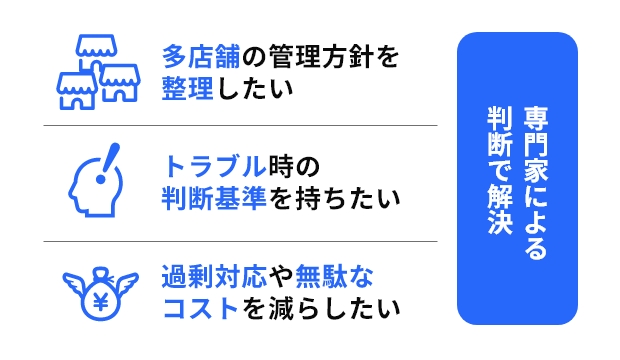 主な内容:管理指針策定、店舗タイプ別基準整理、社内ルール整備支援、年2回レビュー