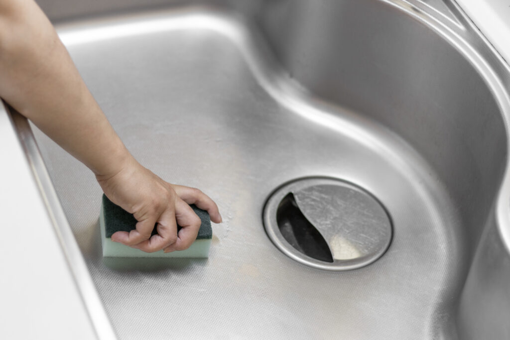 ステンレスシンクの場合は、傷が付きやすいので柔らかいスポンジを使用してください。金属たわしは、ステンレスシンクを傷付けてしまうため避けましょう。